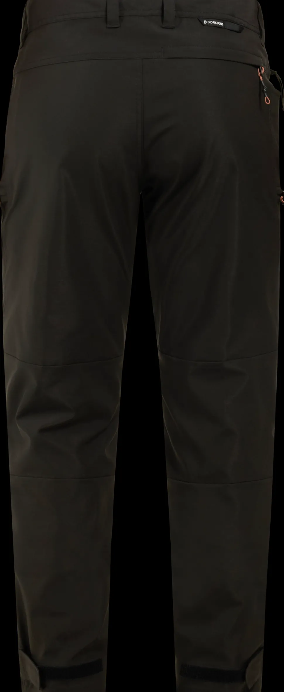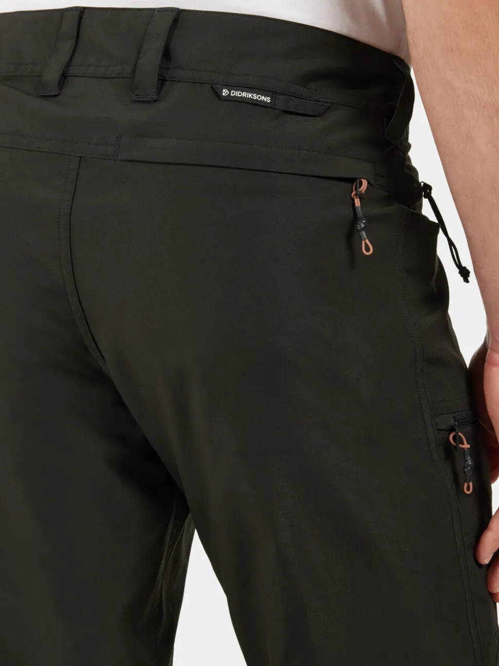 Säärien sisäpuolen saumat on siirretty eteenpäin hankautumisen välttämiseksi, ja lahkeiden päitä voi säätää tarranauhalla. Housuissa on käytännölliset taskut, mukaan lukien takatasku ja puhelintasku yhden ulkotaskun sisällä. Housuissa on myös vyölenkit ja vetoketjullinen sepalus.