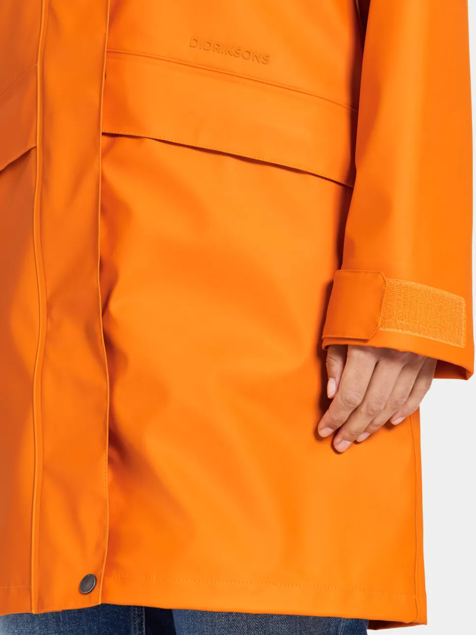 Kaksisuuntaisella etuvetoketjulla ja käytännöllisillä etutaskuilla varustettu Elly on sekä käytännöllinen että mukava. Materiaalissa on vettähylkivä pintakäsittely, joka ei sisällä PVC:tä, joten se on luotettava valinta kaikissa sääolosuhteissa.