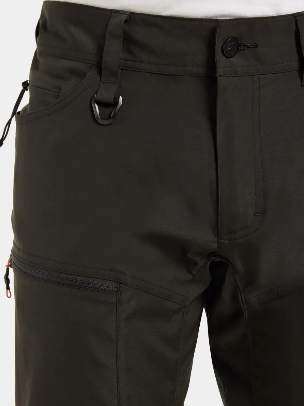 Säärien sisäpuolen saumat on siirretty eteenpäin hankautumisen välttämiseksi, ja lahkeiden päitä voi säätää tarranauhalla. Housuissa on käytännölliset taskut, mukaan lukien takatasku ja puhelintasku yhden ulkotaskun sisällä. Housuissa on myös vyölenkit ja vetoketjullinen sepalus.