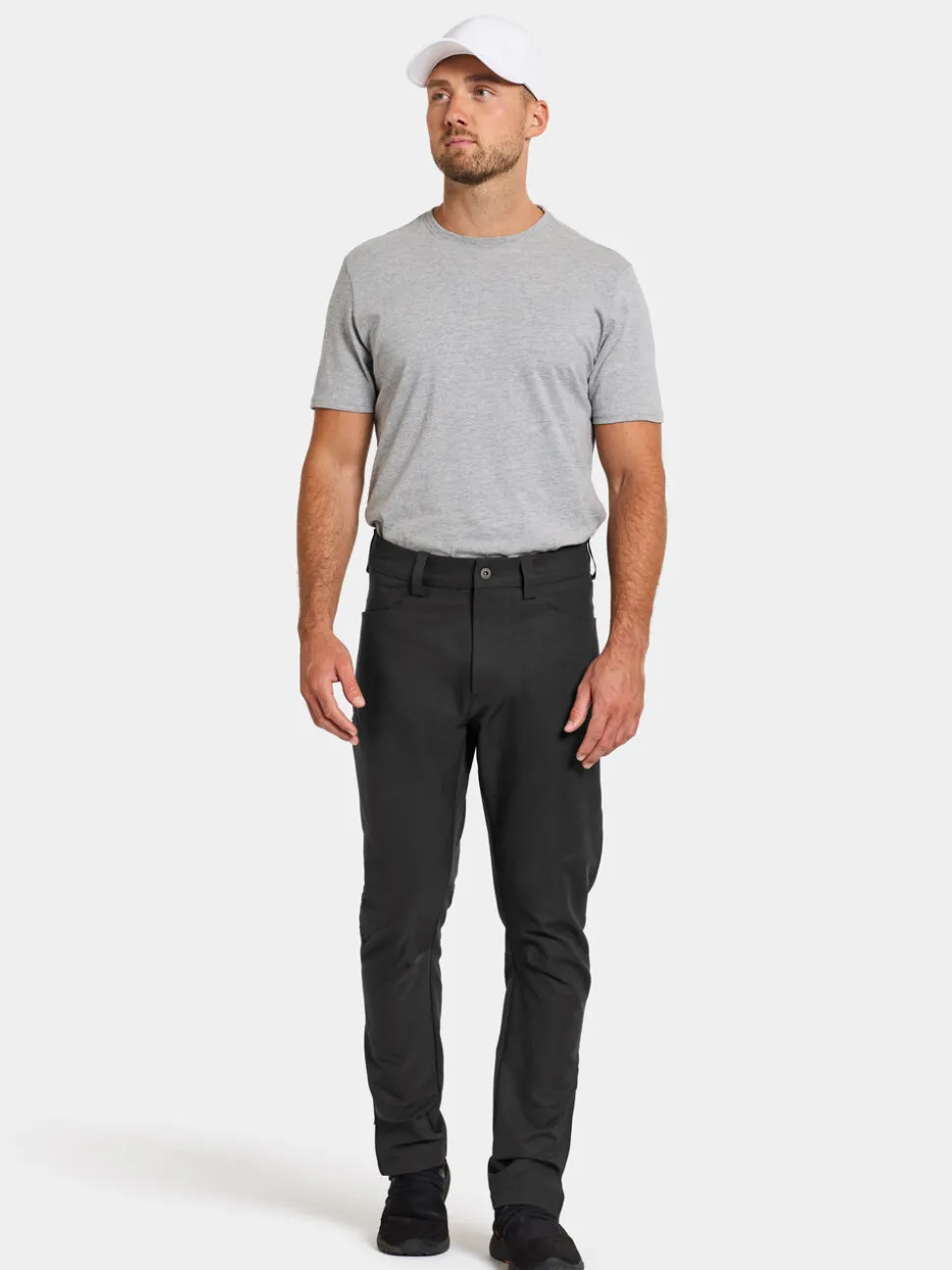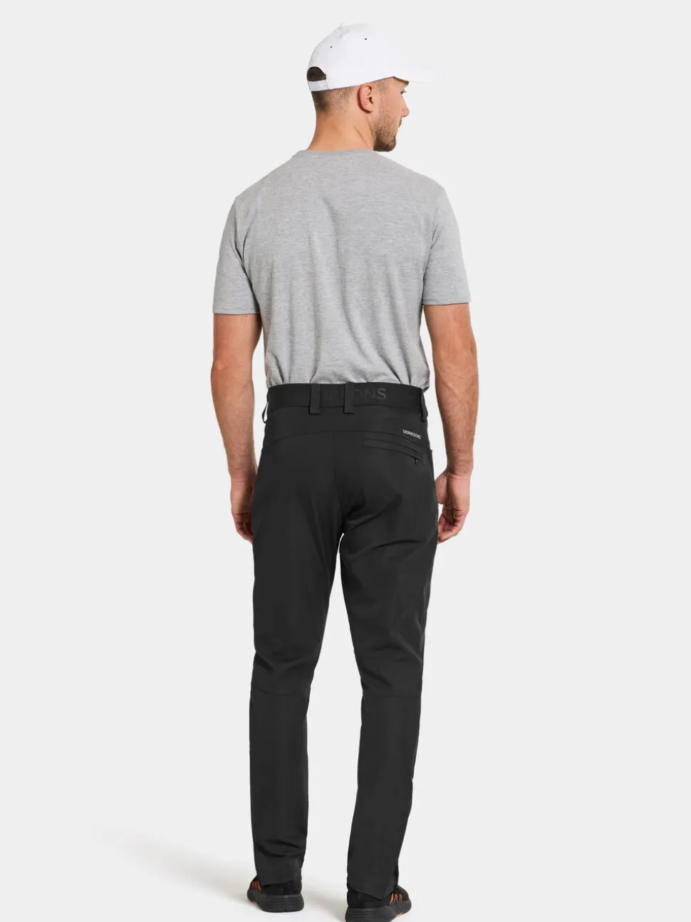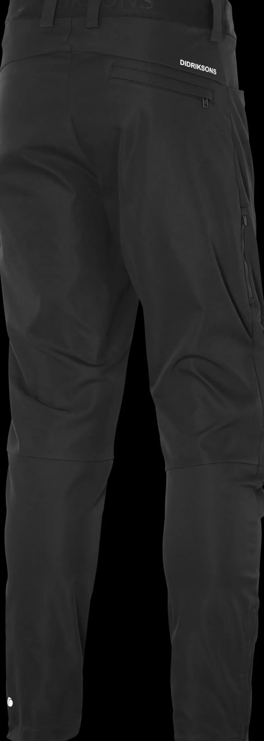 Vettähylkivästä materiaalista valmistetut kestävät housut. Takaosassa oleva resori takaa parhaan mahdollisen istuvuuden. Housut on valmistettu kestävästä Sorona®-materiaalista, joka vähentää energiankulutusta ja päästöjä valmistusprosessissa. Chinotyyliset housut on valmistettu pehmeästä puuvillamaisesta twill-materiaalista. Lahkeensuiden leveyttä voidaan säätää sivulla olevalla vetoketjulla. Moderni malli esimuotoilluilla polvilla ja kapeammilla lahkeensuilla. Kaksi etutaskua, tasku lahkeessa ja vetoketjullinen takatasku. Didriksons-logo lahkeensuussa toimii heijastavana yksityiskohtana. Vyölenkit. Tuotteessa on PFC-vapaa vedenhylkivyyskäsittely.