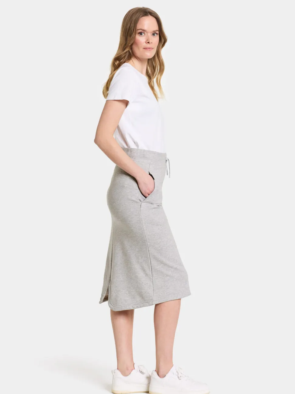 Resö on pehmeä ja mukava hame collegekankaasta, joka sopii täydellisesti jokapäiväisiin hetkiin. Hameessa on säädettävä vyötärö, jossa on kiristysnauha yksilöllistä istuvuutta varten, ja käytännölliset etutaskut. Joustava kangas tarjoaa liikkumisvapautta ja mukavuutta koko päiväksi. Valmistettu luomupuuvillasta ja 100-prosenttisesti kierrätetyistä kuiduista, joten se on kestävä valinta vaatekaappiisi.